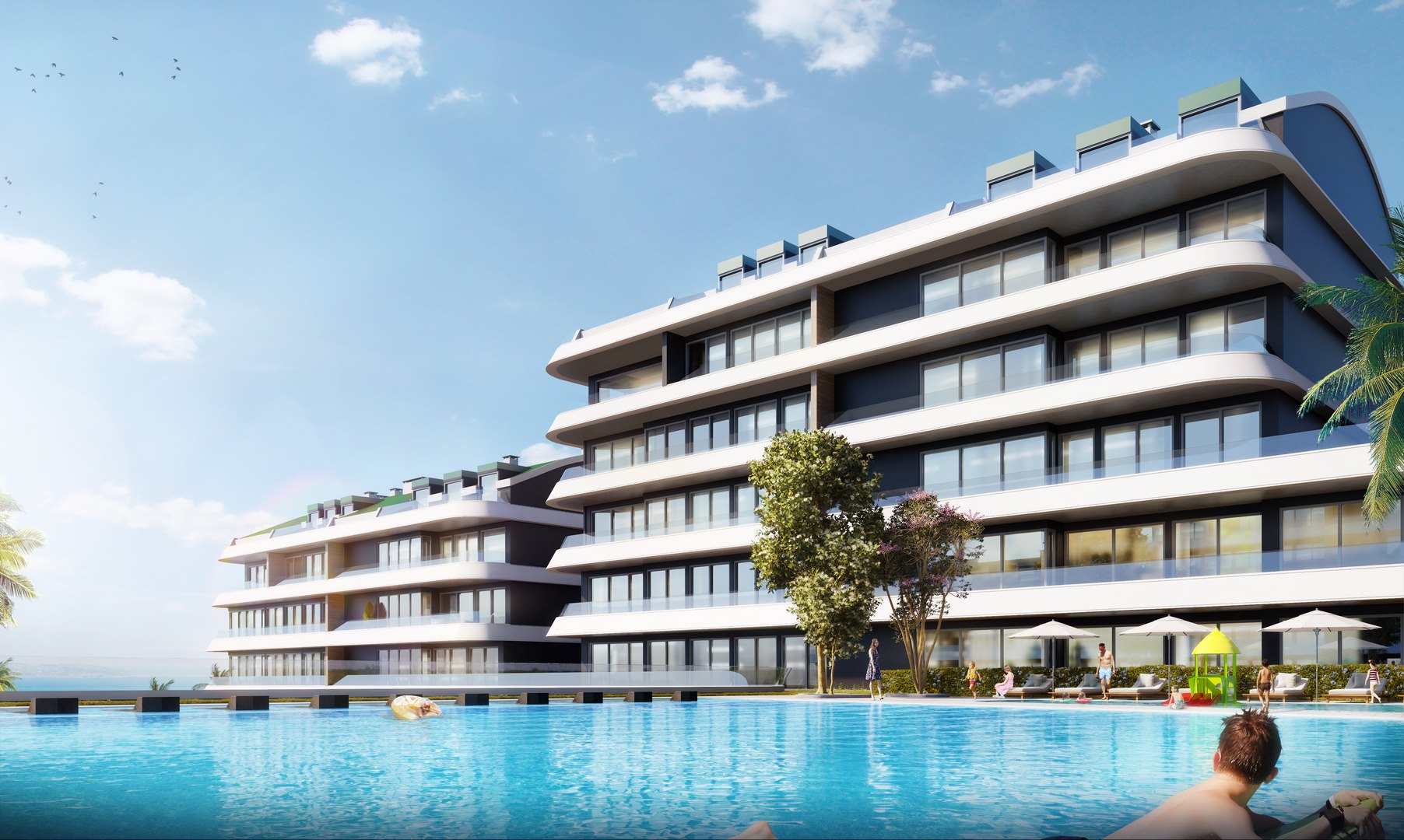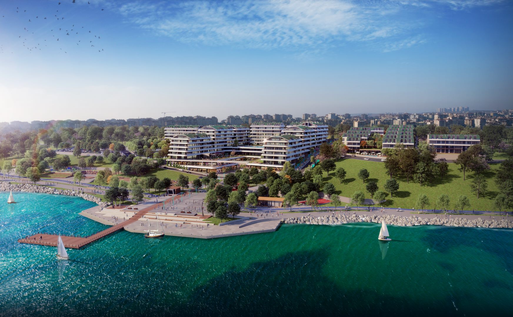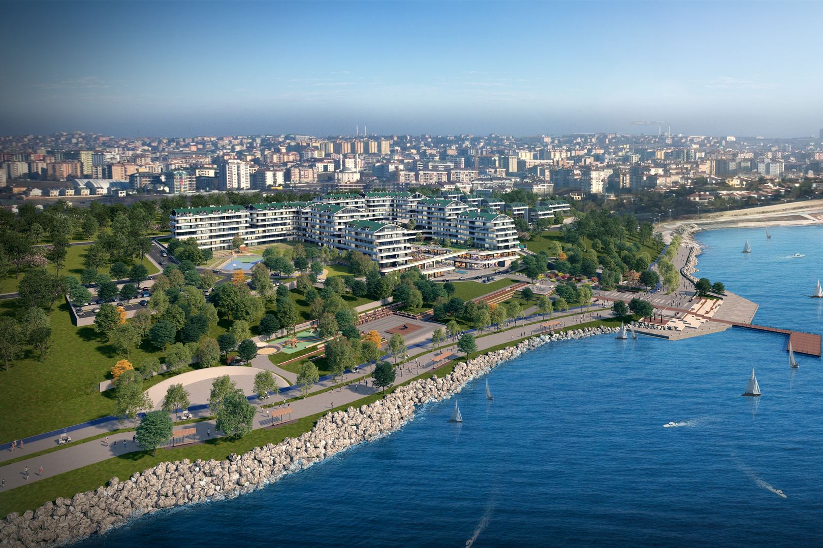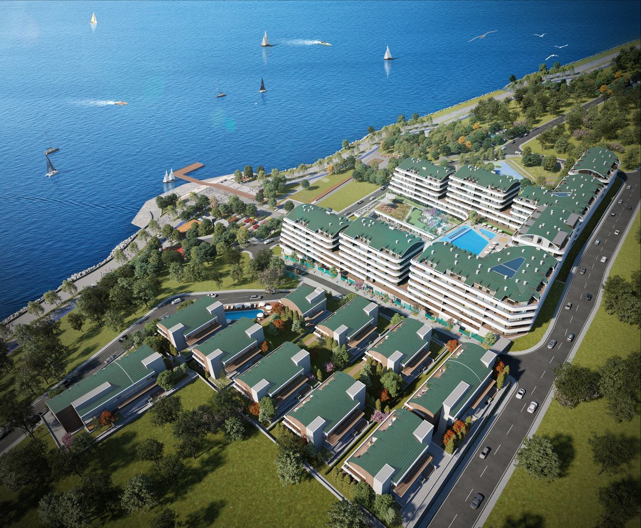 Investment apartments by the sea for sale in installments in Büyükçekmece-Istanbul /Turkey in a residential project that will be built on 121,406 sqm of land in Mimaroba area located on 13 km long coastal beach, allowing 95% of the project living areas to enjoy the seaview. Furthermore, a commercial area of 10,000 sqm is allocated for the Marina Market with zero distance to sea.